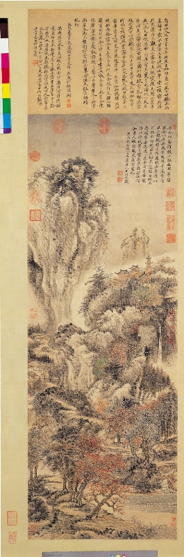 此幀描繪秋日山林景色,主體山勢圓轉重疊,高聳突兀,山溪逶迤,漣漪陣起。佈局構景繁密,山勢深奇,植披濃密厚重,林木紅翠相間,秋光熠熠。