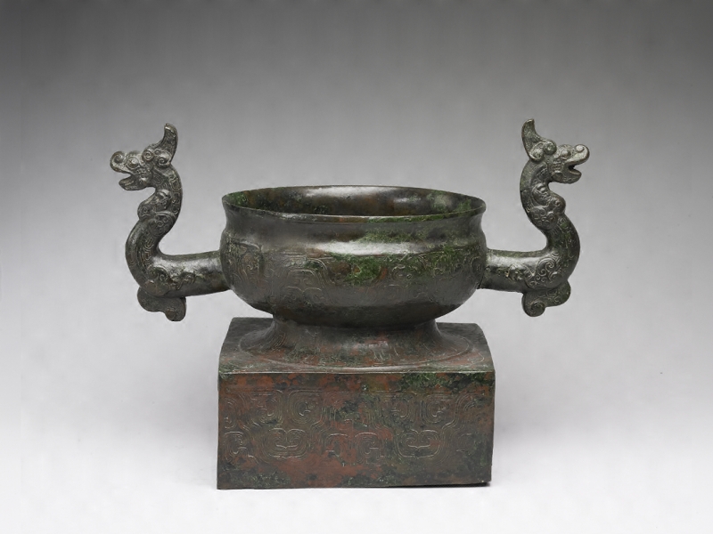 陳侯午方座簋,器形復古,兩龍形獸耳外伸,比例上略大,上有重環紋與圓渦紋,腹部、圈足與方座飾波曲紋。腹內有銘文8行36字:「隹(唯)十又四年, (陳)侯午台(以)群者(諸)侯獻金乍(作)皇妣孝大妃祭器, (敦)台(以)蒸,台(以)嘗保又(有)齊邦,永 (世)毋忘」。記田齊桓公(即陳侯午)十四年為先母孝大妃作此祭器之事。銘文記載齊太公和之子桓公田午之重要史料,作器時間在公元前371年,可補文獻之不足。