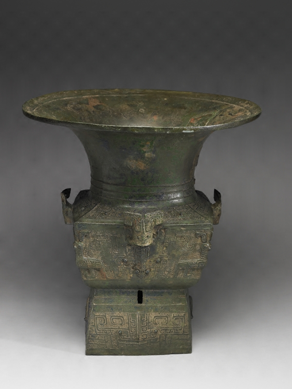 大口、圓脰、方形腹、方形足。此方圓共現一器形制極特別。脰飾弦紋,肩上夔紋,腹部飾獸面紋,獸鼻猶如蛇首,有鼓起的雙眼。此器方圓合構,其蛇首形鼻獸面紋飾及高浮雕鳥紋,造型或紋飾皆特殊,具有南方區域特性。於研究古代銅器工藝上,具有重要價值。