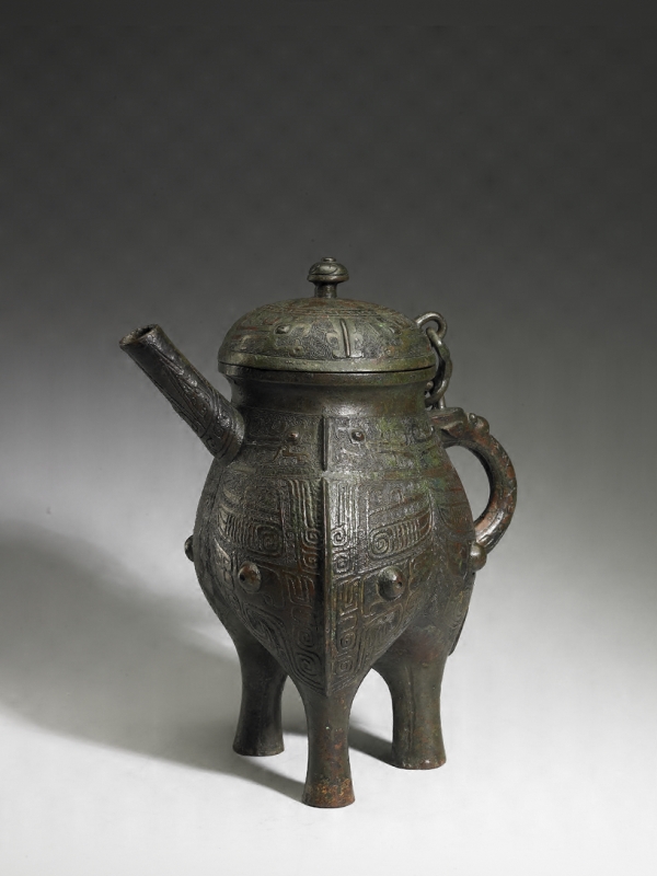鬲形腹三實足,器身側出一流,有蓋。鋬飾牛首,蓋以蓋鈕為中心,飾四瓣花紋及鋸齒狀邊飾,蓋沿飾夔紋。頸飾夔紋,腹飾細長羽紋的獸面紋。蓋器有對銘,各3字「□父丁」。此器紋飾精美,工藝獨特,銘文亦具重要史料價值。「盉」兼具酒、水器功能,具重要代表性。且為清宮舊藏之商周銅器精品。