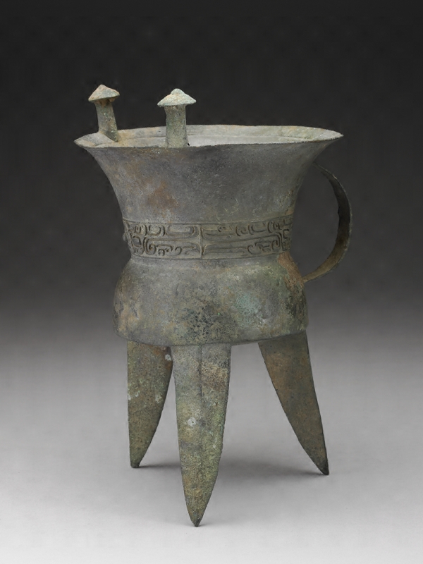 本器三錐狀足帶鋬,器口有兩立柱。器身飾獸面紋,立柱上飾渦紋。器形、紋飾皆是二里岡上層期典型,是同類型銅斝中的精品。