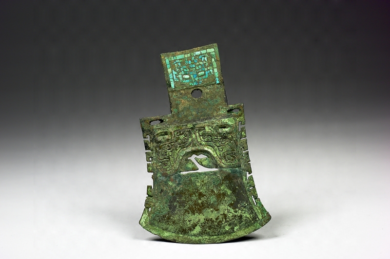 帶肩器身,腰線呈內凹形,內扁平。器身上有獸面紋,內上有松綠石及孔雀石鑲嵌的獸面紋。
