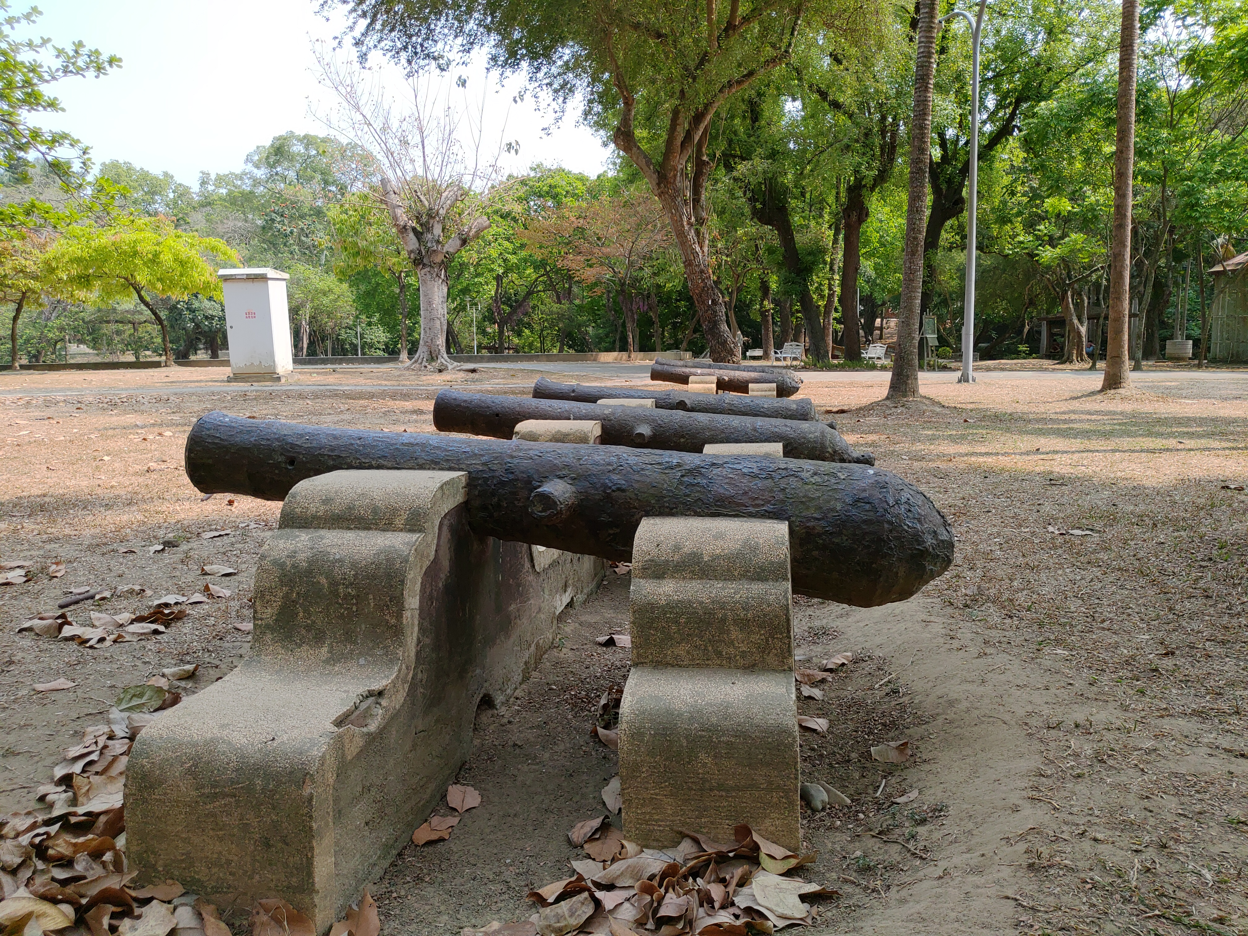 「清代嘉慶年間鐵炮二門」現存鐵炮共有12門,約於1975年被移至嘉義公園內放置,原放置處不詳。12門鐵炮型式均同,目前指定其中2門可辨識年代的鐵炮。鐵炮完成於1807年(清嘉慶12年),為清代海防重要的軍事設施。炮體長203公分、寬32公分、砲口內徑9公分,以鐵鑄造成。鐵炮屬於前膛砲,以炮口為前,圓型炮身前窄後寬,炮身有三層套箍,有炮耳、門眼及炮鈕,砲身尾端呈尖錐型 。其中一門炮身有陽鑄楷書銘文,記載鑄成年代、重量與鑄造單位。銘文採直書書寫,共有五行文字:「嘉慶十二年秋,奉閩浙總督部堂阿,福建巡撫部院張,鑄造臺協水師左營大砲,一位重一千斤」。「閩浙總督部堂阿」中「阿」指「阿林保」;「福建巡撫部院張」指「張師誠」。