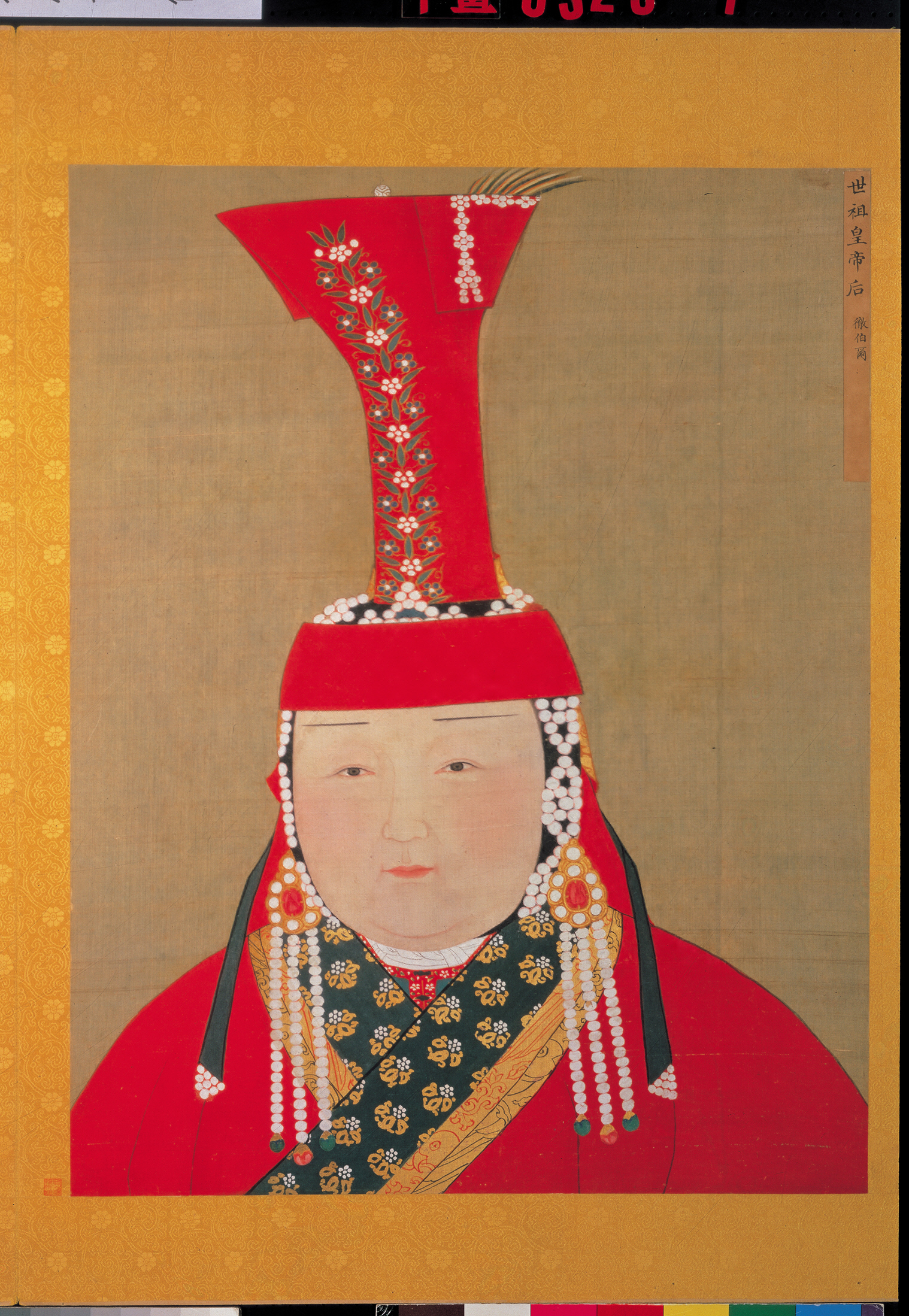 此冊原為南薰殿舊藏,計十五幅,畫中的元代后妃皆頭戴蒙古族特有的罟罟冠(又稱姑姑冠)。此冠一般以兩塊樺皮圍合圓筒,外裹紅絲綢,綴以珠飾,冠頂插雄尾。袍服錦緣為元代御用「納石失」伊斯蘭風格織金錦,已知作坊設於大都(今北京)。部份線條仍可見修改痕跡,判斷此冊帝后半身像可能具有底稿之功能。據《元代畫塑記》宮廷肖像畫家李肖岩,曾於延祐七年(1320)、天歷二年(1329)仁宗、文宗在位之時,兩度奉詔「依世祖皇帝御容之制」,繪製仁宗、武宗及皇后御容。推測元代帝后半身像冊,其中可能與李肖岩有關。元代宮廷御容繪製,融合中原傳統與域外風格,其繪面容與衣飾細部表現手法,如凹凸渲染畫法、眉鬚與皺紋線條,衣紋略有粗細變化,人物形象生動鮮明,不拘泥於傳統繪技法。