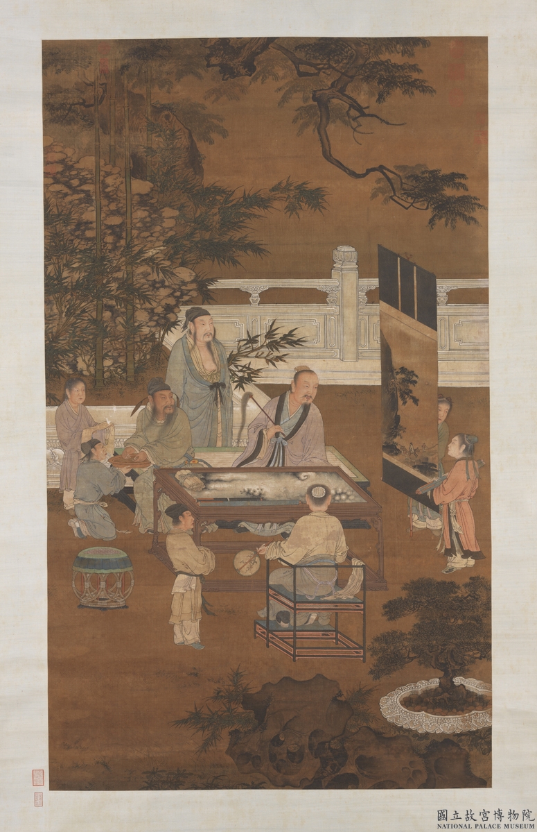 國立故宮博物院院藏宋人〈十八學士〉四軸,分別結合「琴棋書畫」四藝的主題,形成完整的一套。 此軸為「畫」藝主題,畫槐陰下,翠竹數竿,間以文石。畫中四人一握團扇,一執塵尾,一盥手回眸,另一則袒衣立於後,諸人皆專注凝視畫幀,神態悠雅閒適,若沉醉於畫幅景境之中。畫中「邊角」山水以斧劈皴與水墨刷染,樹葉用筆疾速,與明人仿南宋馬遠作品構圖筆法相似。 雖依其畫風或畫中的器物來看,此四軸當成於明代,可是畫作設色穠麗而富麗,繪製精謹,乃明代宮廷院體畫上乘作品。畫中細節,譬如各式家具、盆景、花台、茶酒瓷器用具、冠服衣飾、文房用具、線裝書籍等,繪製之準確都可與現今明代出土文物相互應證,真實呈現明代中晚期盛行的文人雅士清賞文化。 存世古畫成套者稀有,本套保存完整,更是難得,極具有其歷史、文化及藝術價值。