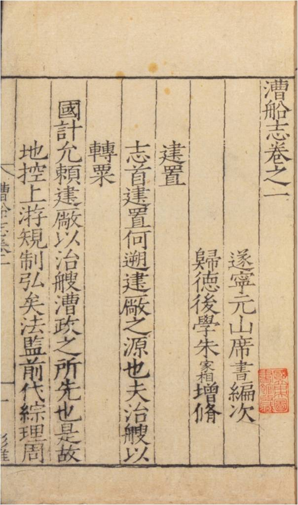 八卷。編者敘稱,漕舟所繫,匪惟控御南北,所以跨四海而肅百蠻者,亦尚倚壯於斯。書承朝命來領淮廠,凡關於舟事者,考尋故典,採拾大要,編次一帙,名曰《漕船志》,使國家文獻有徵云云。此書為記載明代漕船修造、管理等之專志,可提供研究明代漕運史、吏治史及社會生活史豐富詳實之資料。