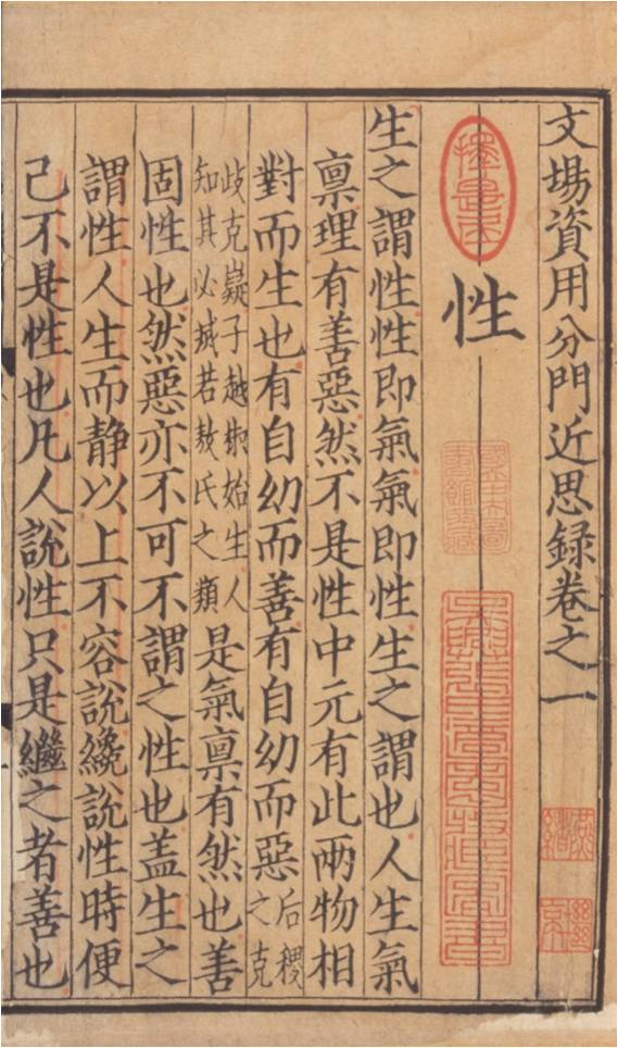 二十卷。 《近思錄》由南宋學者朱熹和呂祖謙合編,選輯北宋理學家周敦頤、程顥、程頤、張載四人語錄而成書,全書分十四卷。此本將原書十四卷析為二十卷,並依內容分列條目,每條起首以大字標目,條目並註明為何人語。宋刻宋印,版面清晰。未聞他處藏有同版。