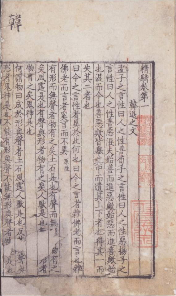 存三卷(卷一至卷三);刊本。 此書摘錄唐宋古文大家之精言美句,全書原六卷,此本存卷一韓退之文、柳子厚文、李文公文、唐文粹,卷二歐陽文忠公文集、王荊公文集、嘉祐集,卷三東坡文集、東坡易解,文中有朱墨筆點讀,字體秀麗,版面清楚,刻印甚精。
