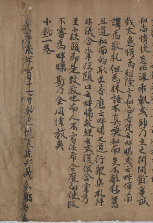一卷;寫本 凡一卷,此卷雜鈔戒律儀法。卷末有題記云:「乾符貳年(875,唐僖宗二年)四月十七日納邑判官孫興晟分配如後」。此卷之部分內容與《大正新修大藏經》(簡稱《大正藏》)第八十五卷古逸部號2790律雜鈔相同,而《大正藏》係據巴黎藏敦煌本伯希和2064號排印。