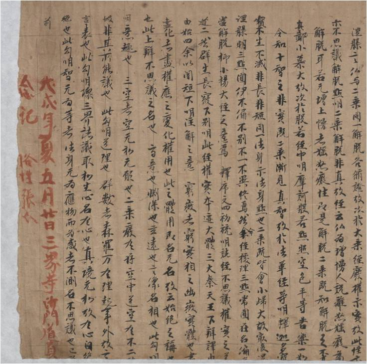 唐人寫卷子本。 凡上下二卷,此本存卷上。又稱《淨名經關中釋批》、《關中疏釋批》。佛典注疏。唐釋道液撰。此本《釋抄》與同作者所撰《淨名經集解關中疏》不同,是以隋智顗所撰六卷本《維摩經玄疏》為主,吸收了各家對《維摩經》注釋並加批釋而撰成,釋義精要。此經舊藏未錄,敦煌出土後,被收入日本《大正藏》第八十五卷。卷末有題記,云「戊戌年夏五月二十日三界寺沙門道真念記,俗性〔姓〕張氏」。考英、法所藏敦煌寫經,頗有署「道真」名者,大抵為五代北宋時人。 敦煌遺書寫卷,為研究當時文化歷史不可缺少之代表性證物,罕見稀有,具特殊歷史、文化與學術價值。