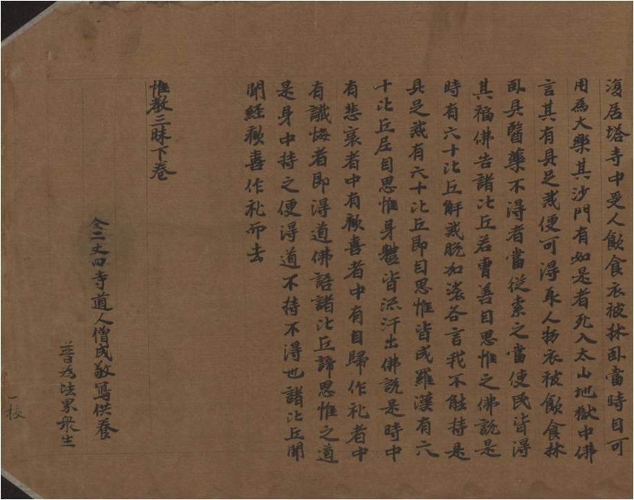 六朝釋僧成寫卷子本。 書名依據尾題,此卷首缺尾完,各藏未見收錄。卷末題「惟教三昩下卷」,知原應有上、下或上、中、下分卷。此卷字體古樸,異體俗體字多,且卷末有「一校」字樣,似為六朝人寫本。 敦煌遺書寫卷,為研究當時文化歷史不可缺少之代表性證物,罕見稀有,具特殊歷史、文化與學術價值。