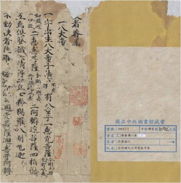 日本建久六年(1195) (宋寧宗慶元元年)寫卷子本。 凡一卷,此卷首行頂格題「□者卷屬」,首字破損,唯下角尚存一二筆痕跡,應為「使」字。卷首有「高山寺」(位於日本京都)朱文長方印、「星吾海外訪得秘笈」及「楊印守敬」藏書印,為清楊守敬舊藏,得之於東瀛,其所著《日本訪書志》亦未見言及此卷。 日本寫卷,罕見稀有,為研究當時文化歷史不可缺少之代表性證物,具重要歷史、文化與學術價值。