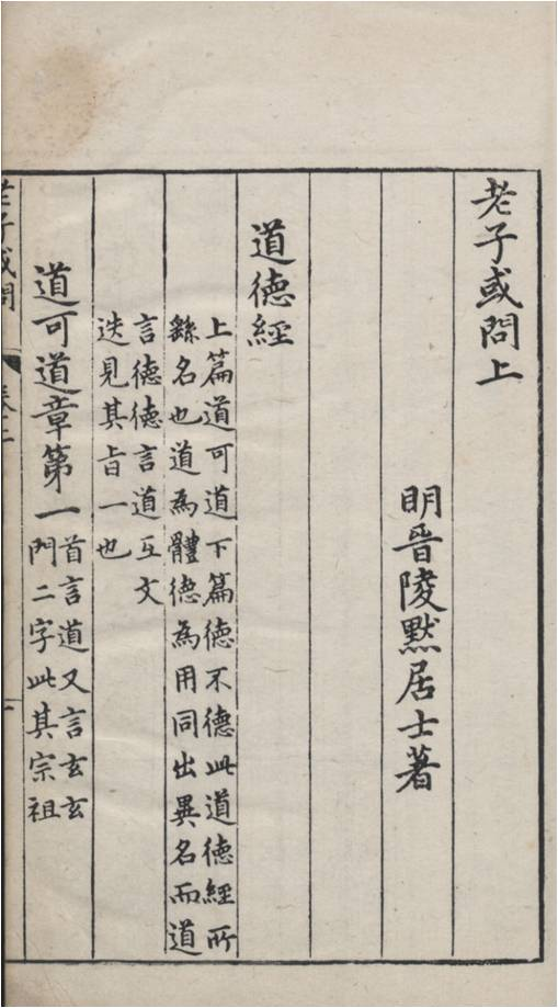 二卷;刊本。 王時槐跋稱老子致虛守靜,不為天下先,猶易乾初傳之稱潛龍,故龔修默手著《老子或問》,發明詳悉,覽者當知學之本於潛也,庶可幾於龍德。