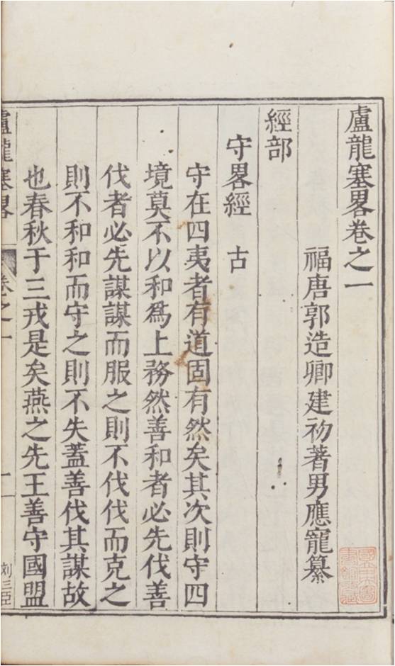明萬曆庚戌(三十八年,1610)新城王象乾刊本。 明郭造卿嘗撰《燕史》,卷數甚多,縮其半而為永平志,其子應寵又重鈎纂,本諸宋志、參以史略、節縮成書,總曰《盧龍塞略》。首以圖經,次以譜表,又曰紀、曰傳、曰考、曰議,以至阨塞夷譯,基置臚列,而塞事瞭然,亦籌邊者所宜知。此書流傳甚少,刻印頗精,未聞他處藏有同版。 此書流傳較少,明代罕見之版本,具重要歷史、文化與學術價值。