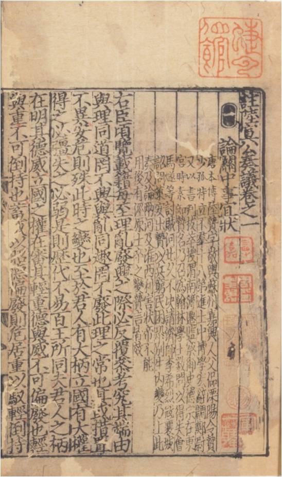 此書應為《經進新註唐陸宣公奏議》(宋紹熙間(1190-1194)刊本)之元刊本,然比較宋本與元本,二者卷數既殊,文之次第亦異,且郎氏原註元本乃多所刪落。書之卷首有部分文字為鈔補,書中書眉刻南宋謝疊山先生評語,或坊賈所託。清阮元嘗進呈四庫未收書六十餘種,此書即其中之一。書前有清周星詒過錄阮元、張穆題識並手跋。