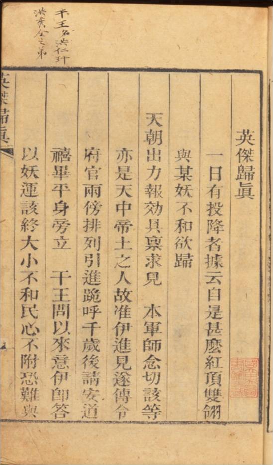 一卷 此書即何春發等人奉命撰寫,旨在宣揚太平天國的革命思想者。全書假設干王與一降者問答,解釋太平天國諸種禮儀制度,並申明「天朝天曆並無凶煞生剋休咎,蓋知天體運行乃自然規律」等新觀念。太平天國立國僅十餘年,所刻書不多,頗為珍貴。