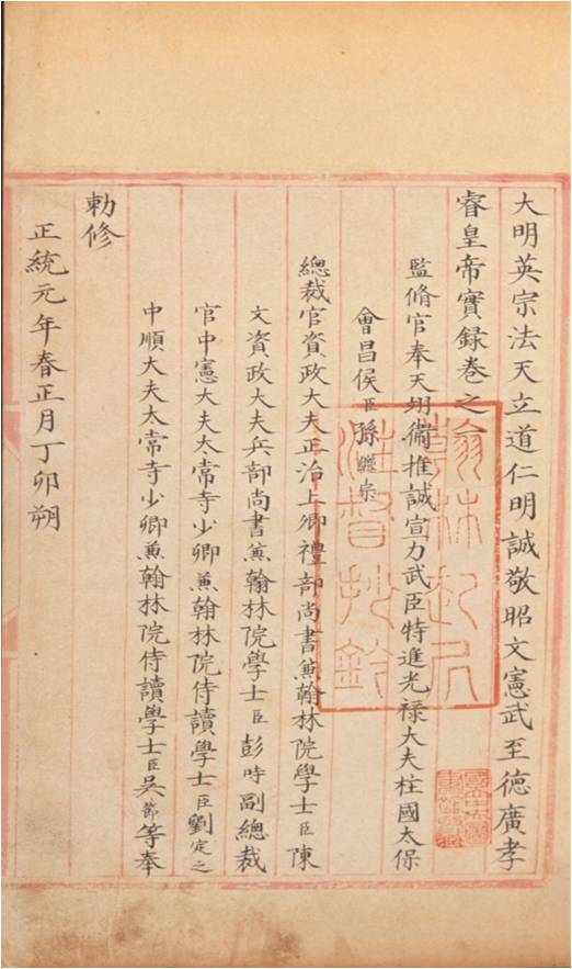 明翰林院紅格鈔本。 撰者陳文(1405-1468)字安簡,號褧齋,廬陵人。正統元年(1436)進士,累官禮部尚書,兼文淵閣大學士,卒諡莊靖。 明翰林院紅格鈔本皇帝實錄之一,具保存及參考價值。此本為英宗實錄,記載明第六代皇帝英宗事蹟的編年體史書。原三百六十一卷,今存各卷卷端及尾題的卷次俱被剜去,經查為卷十三至卷十七、卷一百八十七至一百九十、卷二百七十四至二百七十八。 明翰林院鈔本古籍,罕見稀有,具重要歷史、文化與學術價值。