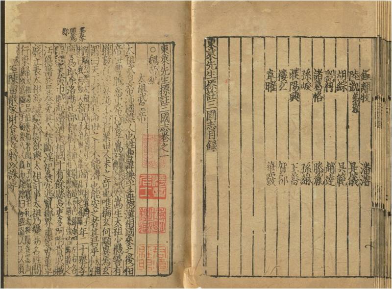 宋末元初間(1225-1311)建刊本。 撰者陳壽(233-297),字承祚,安漢縣人,西晉史學家,蜀漢亡國後仕於西晉,少舉孝廉,著有《三國志》,評價甚高。 呂祖謙(1137-1181),字伯恭,壽州人,人稱東萊先生,是南宋時期著名的理學大家之一。 此書中避諱,除缺末筆外,並頗多隨文改字者。各卷前後書名標題即尾題,末「詳節」二字均被剜去,而將書名下的卷次往上移,蓋改以節本充足本,可知坊賈作偽一斑。可作為版本學辨偽之參考。 宋版古籍,罕見稀有,具重要歷史、文化與學術價值。