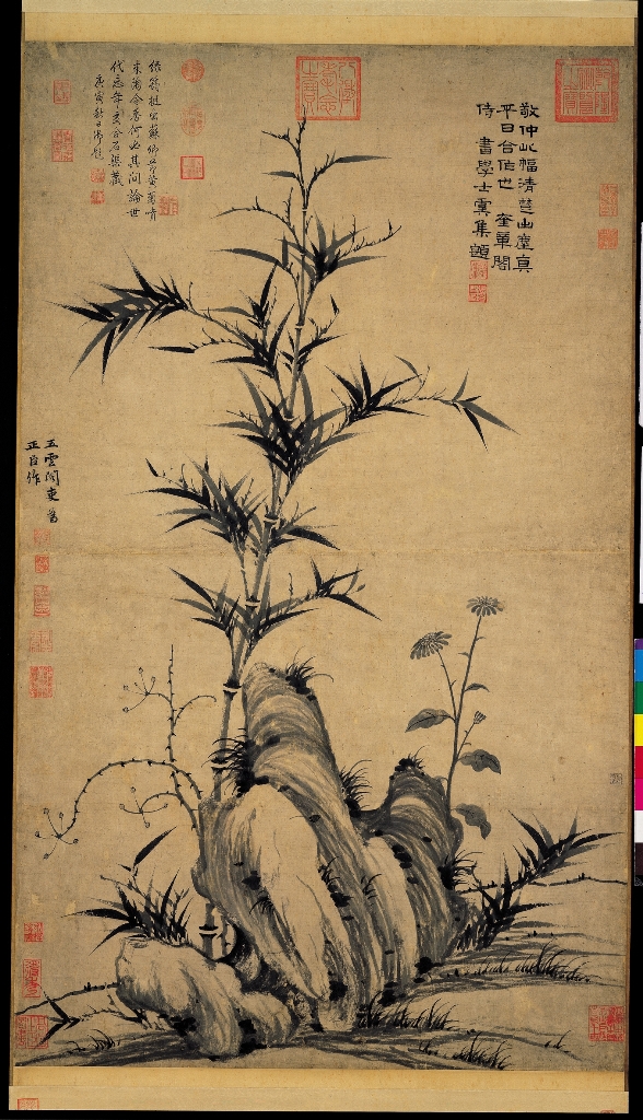 柯九思(西元1312-1365年),浙江台州人。字敬仲,號丹丘生。元文宗置奎章閣,特授學士院鑒書博士,博學能詩文,工書,並善墨竹,亦善山水。此幅為正臣所作,正臣,高昌人,與柯九思為友,富收藏,有東坡墨竹圖,敬仲嘗為作跋。柯敬仲墨竹,醉心於東坡,家藏蘇竹一幅,至臨之數百遍。本幅一竹獨峙,用筆枯勁,襯以菊花坡石,明簡而樸質。