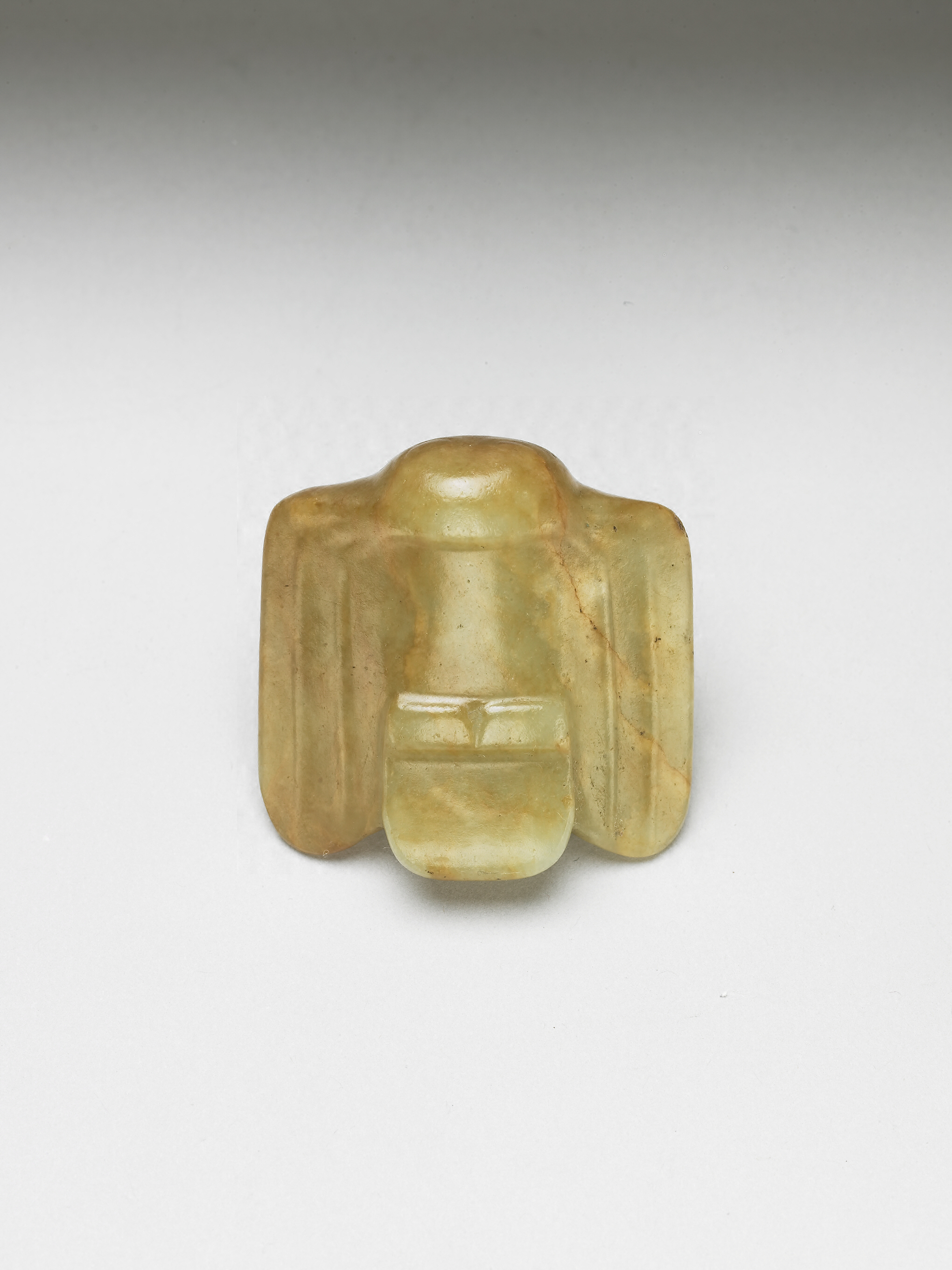 質材:青綠色閃玉質,表面有深淺不一的褐紅色沁斑。 形制:全器琢成一平展雙翼的鳥;頭端較厚,尾端較薄,翼尾微向上翹,弧線優美。鳥頭圓厚,以兩道淺陰線刻的同心圓營造出圓凸的大眼。背面光素,僅於頸部鑽有隧孔,孔內留有螺旋形鑽痕。