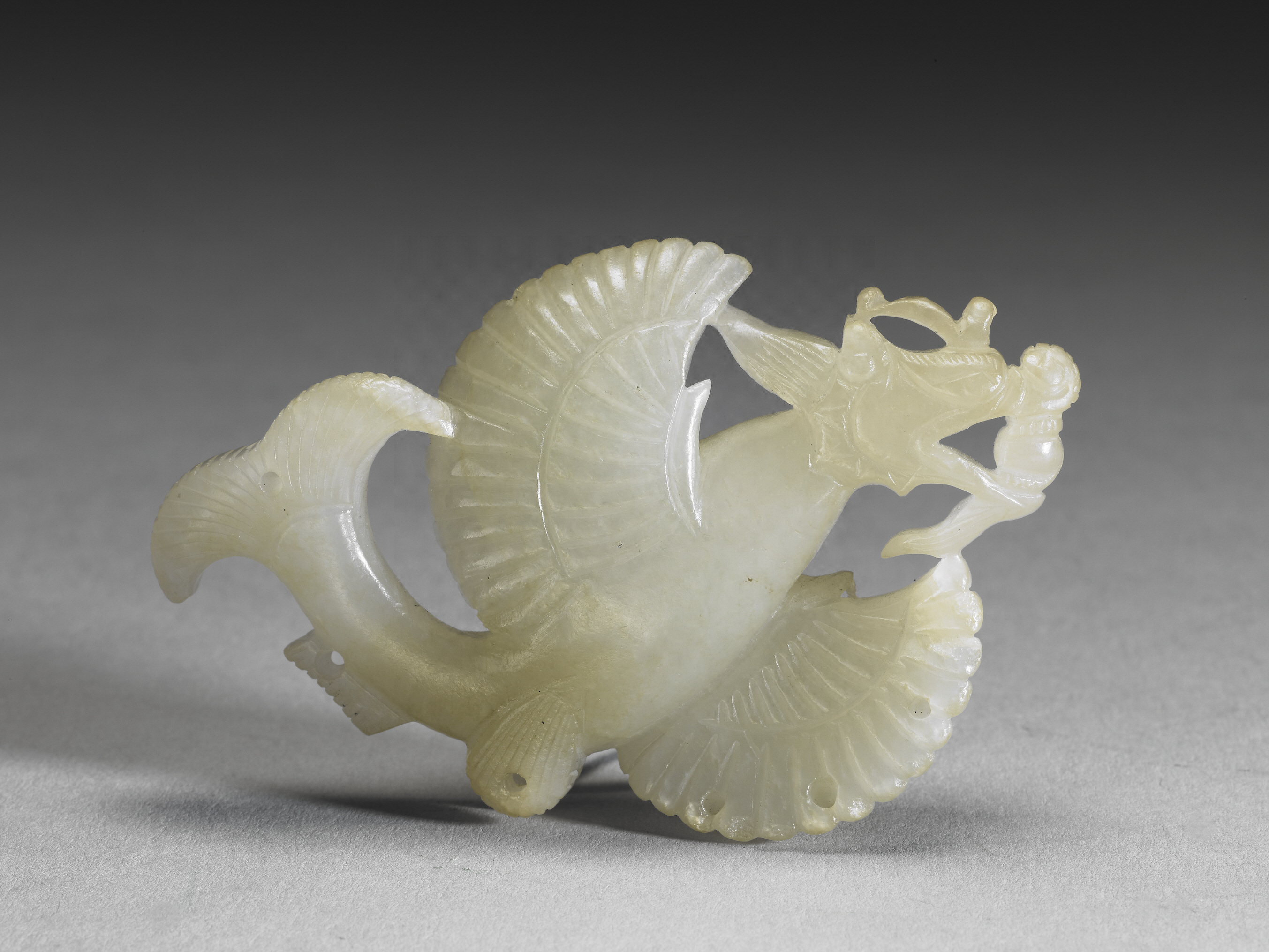 質材:溫潤的青白閃玉質。 形制:龍首、魚身有尾,開展成飛翔狀的雙翼翅。龍口銜珠。在翅、鰭與尾部共有七個圓穿。 參考:遼陳國公主墓出土玉器及河北宣化遼墓之星象圖壁畫中摩羯宮之圖象,此作品應為遼代玉器。