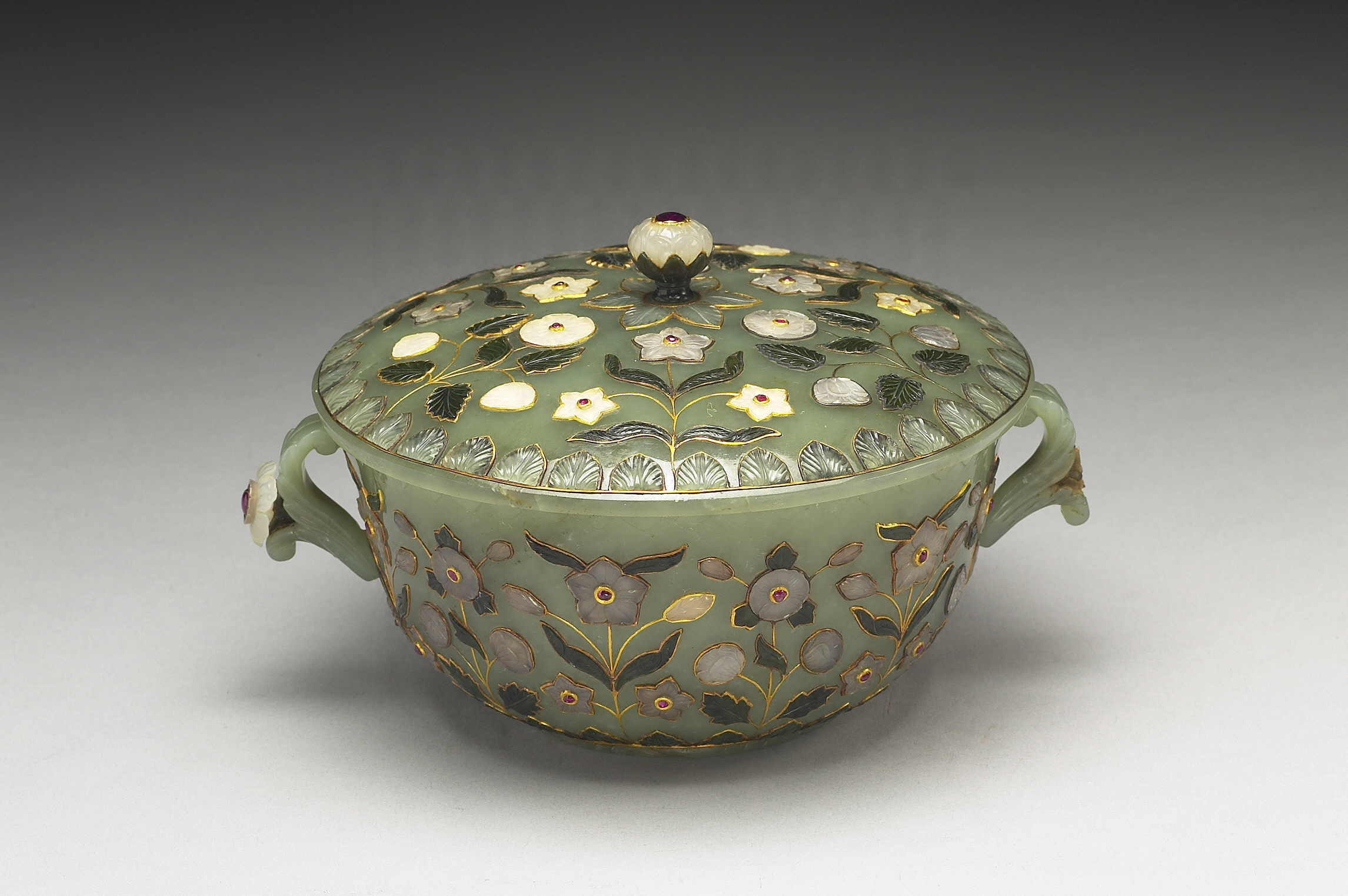 此件印度平口雙柄蓋碗,豆綠色玉,蓋面與腹壁上,嵌飾白玉、碧玉、金屬絲、紅寶石等。碗身比例與常見的蒙兀兒玉碗不同,器底淺浮雕平展的八瓣花。蓋鈕琢成花蕾形。雙柄自腹壁中段向斜上方立雕一捲葉,葉內綻放盛開的小花,與典型蒙兀兒的作法不同,可能是十八世紀在印度為銷售至中國而產生的新款式,對研究中印商業、藝術交流具重要價值。 此器在碗心及蓋內分別刻上「乾隆御用」及「子孫永寶」。