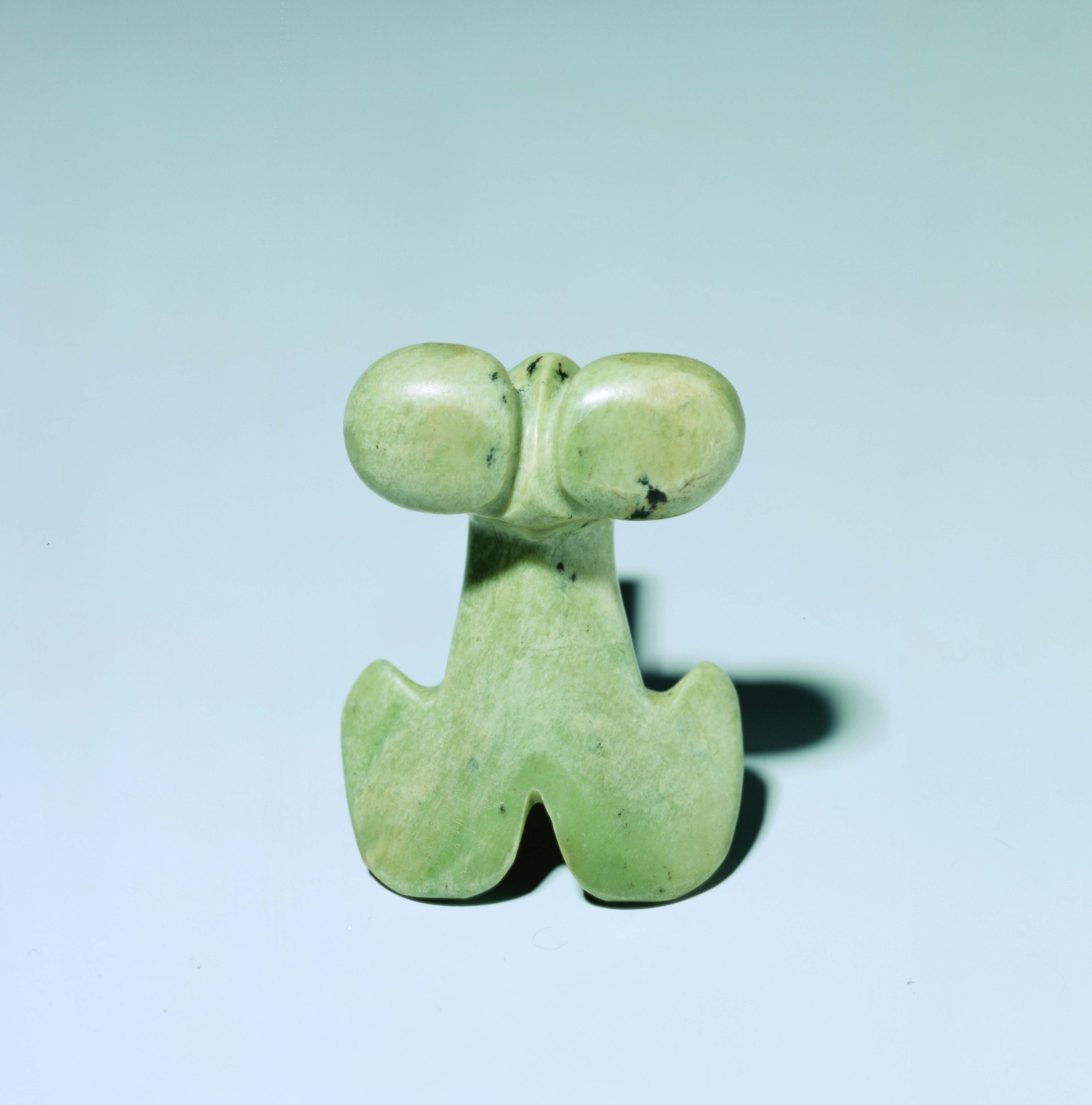 玉質潤澤,形制似蛙背面雕刻一雙大眼及分岔雙肢,腹面頭部有口形凹刻。