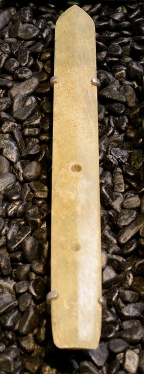 玉色淺綠、帶褐色沁斑,器形細長,外形似「圭」。形制規整,器身帶二穿,尖端刃線圓鈍化,兩側邊平直。