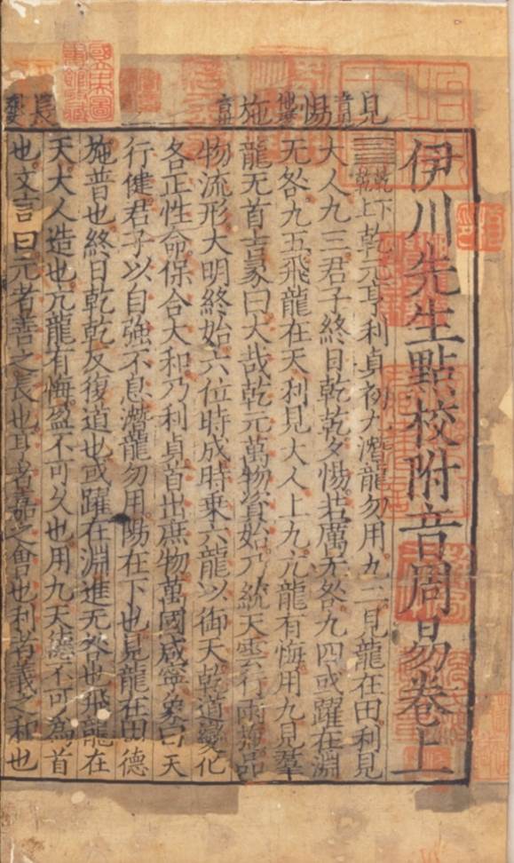 南宋末年建刊本。 此書題宋程頤點校,程頤(1033-1107),字正叔,北宋洛陽伊川人,世稱伊川先生,北宋理學家、教育家。 此書書眉附刻釋音,卷末有刊記稱「寫作大字刊行,刻畫精緻,並無差誤,收書賢士伏幸詳鑑」云云,可見古代出版宣傳手法一斑。 宋版古籍,未聞他處藏有同版,罕見稀有,具重要歷史、文化與學術價值。