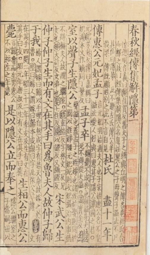 南宋潛府劉氏家塾刊本配補宋建刊纂圖互註本。 撰者杜預(222-285),字元凱,京兆杜陵人,西晉政治家、軍事家、經學家。 此書首卷次行註文小字:陸德明音義曰舊夫子之經與丘明之傳各卷,杜氏合而釋之,故曰「經傳集解」。刊刻者潛府劉氏家塾不詳。查此本各葉左上欄外耳題記公名年次,有圖,又註文之「重言」、「似句」等以白文墨蓋子別出,凡此種種,應是建坊刻書。 宋版古籍,罕見稀有,具重要歷史、文化與學術價值。