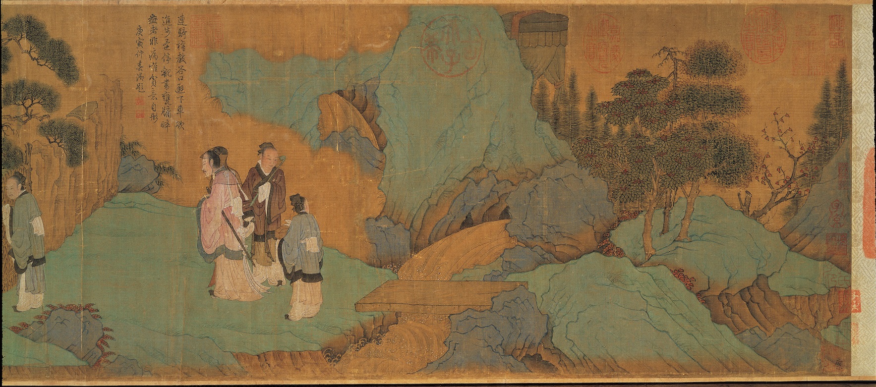 趙孟頫(1254—1332),字子昂,號松雪道人。詩文清遠,書畫復唐宋古風,為後世所宗。本幅山石無皴,僅鉤勒輪廓,後填以青綠,人物衣紋行筆柔暢有力,有唐人古風。故事出於《孔子家語》,描繪子貢見原憲,以昭示君子以德樂道之理。畫幅右下有項元汴千字文「索」字編號。