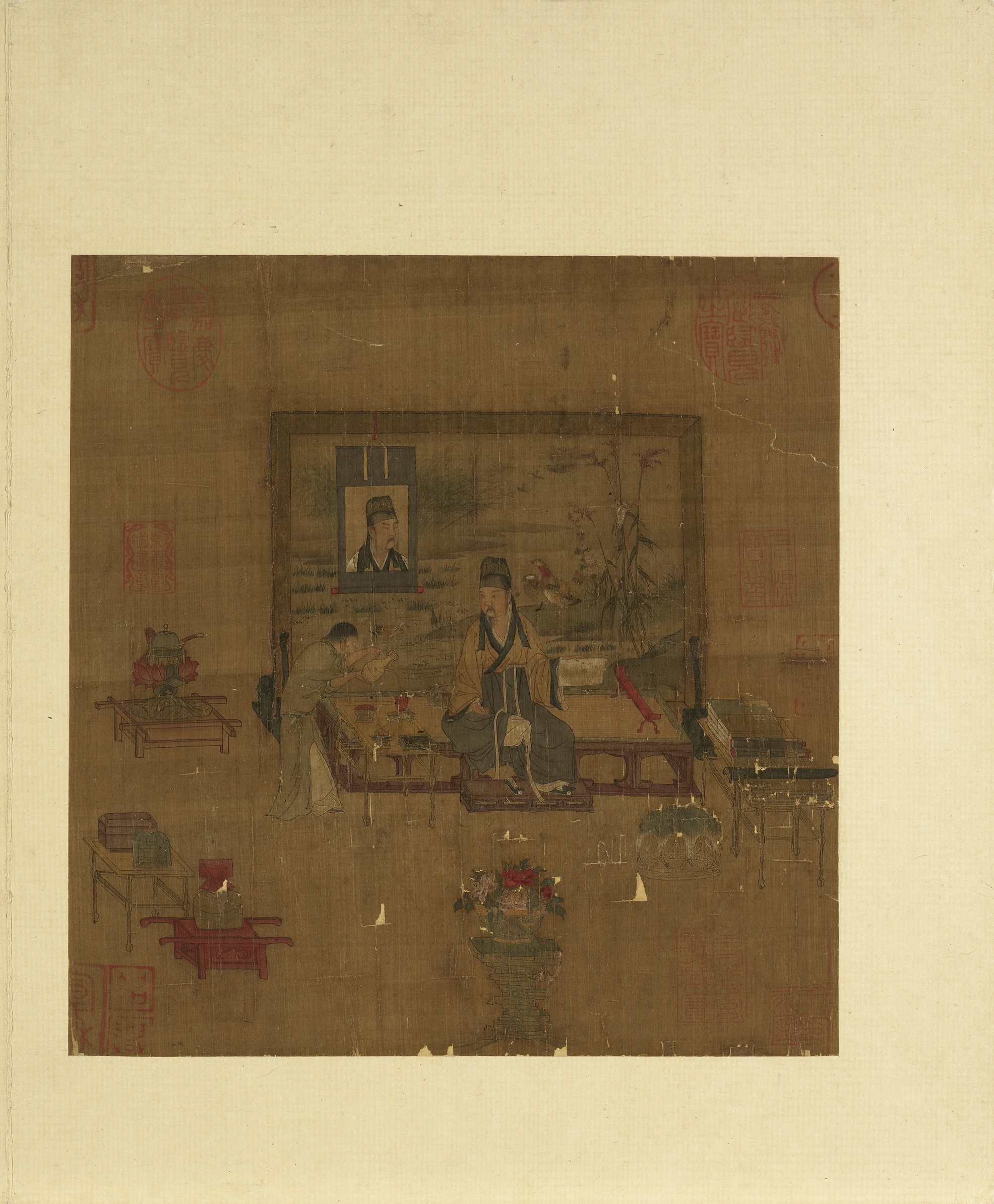 此幅描繪手持紙筆的長鬚文士,隨興地坐於榻上;後方的大屏風上,懸掛文士的半身像;一旁擺設古琴、棋盤、書冊、卷軸、文房、盆花及酒食,以琴棋書畫自娛。 此作雖無款,然其畫風細膩工緻,畫中器具亦可入北宋,為北宋晚期小品佳作。畫中屏風上另掛畫中文士的半身小像,為現存罕見早期的畫中畫作品。