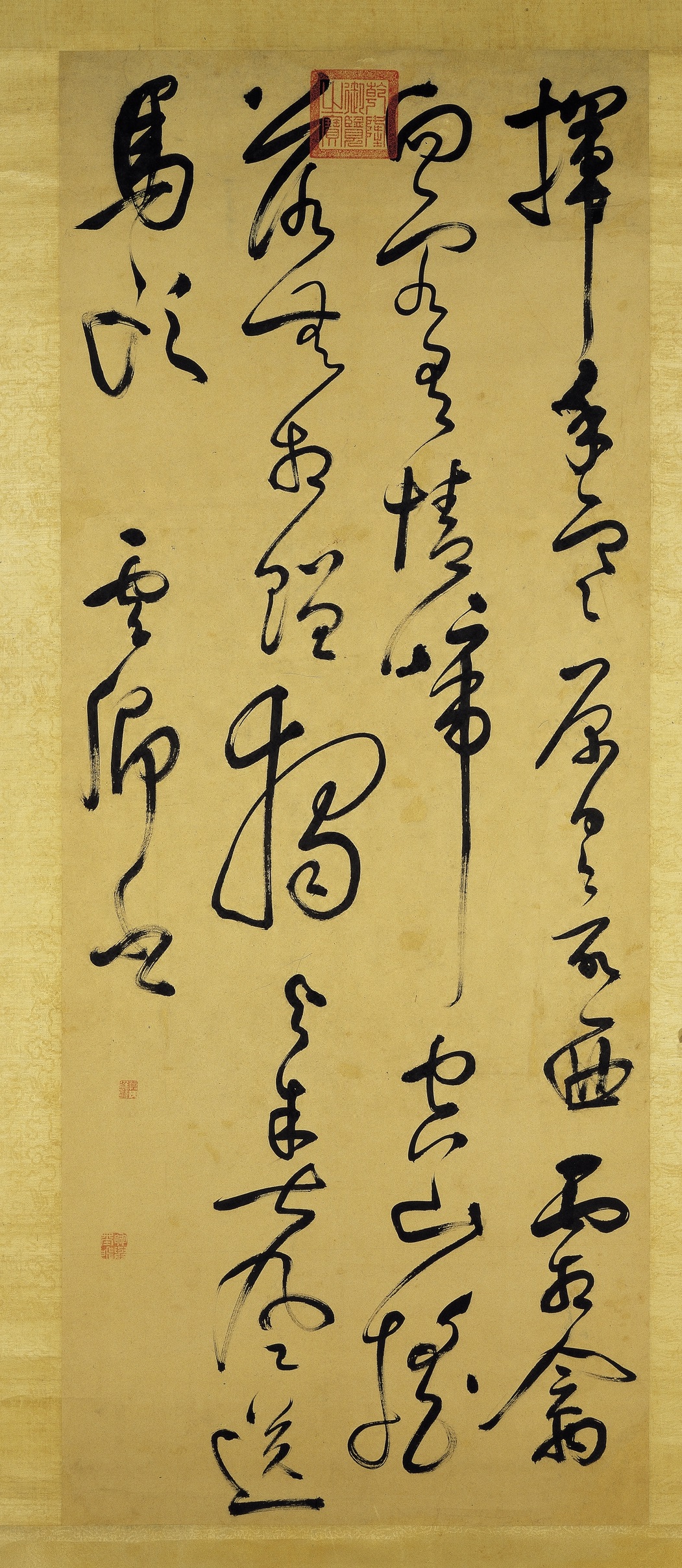 莫是龍(1573-1578),詩、文、書、畫無不專精,著有《畫說》一書。以氣勢雄渾、豪放的行草書法評價最高。此軸除留心字裡行間的呼應關係外,並著意拉長豎畫,形成周圍的餘白。這種計白當黑的表現方式,明顯與元末明初字間緊張的表現有所區隔,明末黃道周、王鐸等人的行草書受其啟發。莫是龍存世立軸書法作品稀少,國立故宮博物院院藏僅此一件,世亦不多見。
