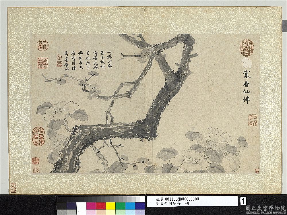 文徵明(1470-1559)明四大家之一,能書善畫,和沈周(1427-1509)並列吳派領袖。 文徵明的花鳥畫作品本不多見,此作運用花鳥畫雙鉤、沒骨、白描和寫意等技法描繪出花卉的清雅,再以山水畫中樹石的厚實筆法來相襯托,製造出粗細、虛實和濃淡、輕重間明顯的對比效果。結合花鳥和山水畫筆意描繪各式花卉,形成粗細、輕重明顯對比,開創花卉作品新風貌,為具個人特色的代表性作品。
