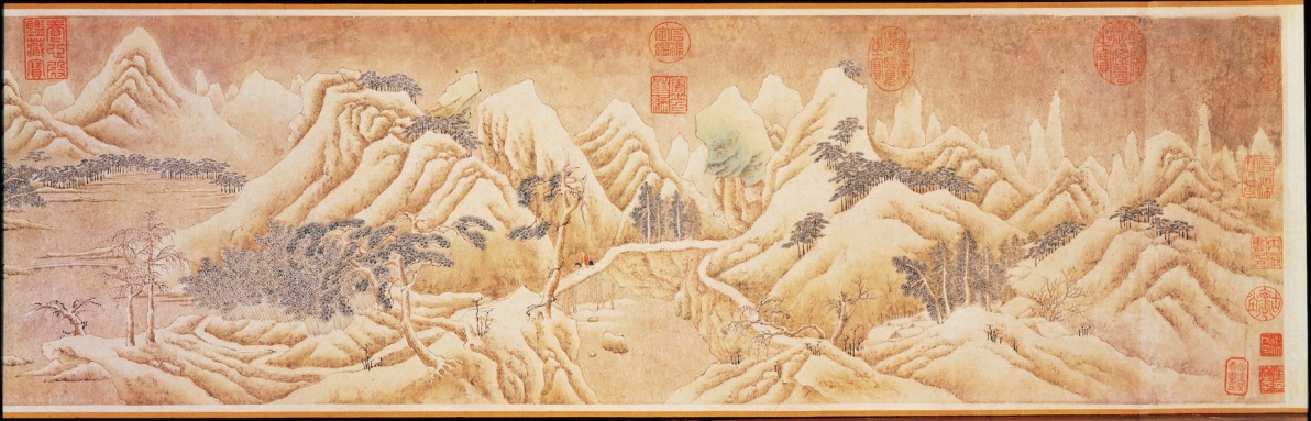 畫幅為長卷,前段山巒起伏、岡阜層疊,山徑幽深。中段溪谷漸開闊,寒林、松杉沿著溪岸而植,江面遼闊,遠處岸邊船隻停泊收帆,積雪深覆;後段山勢連綿橫亙,群山峻嶺間城牆隱約可見。構圖虛實相映,極富變化,若將長卷豎起作長軸觀看,其結構由下而上層層堆疊,升騰的律動與〈倣王蒙山水〉或是晚期〈千巖競秀中構景繁複、山峰層層疊架翻轉的造型,有異曲同工之妙。