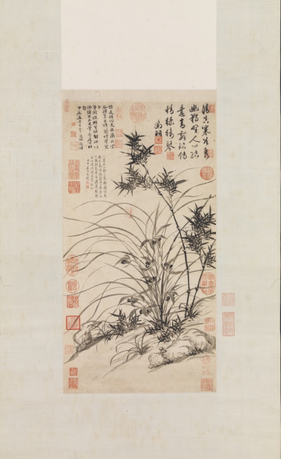文徵明(1470-1559)明四大家之一,能書善畫。繪畫中常見書法意趣,兼擅水墨、設色。和沈周(1427-1509)並列吳派領袖。 幅中竹具八分書沈厚韻味,蘭具行草書揮灑飄逸意趣,運轉自如,揮灑靈動,帶出風的感覺。清朗的筆墨,充滿文人優雅氣息。用筆精到,為文徵明以書法用筆入畫的代表佳作。