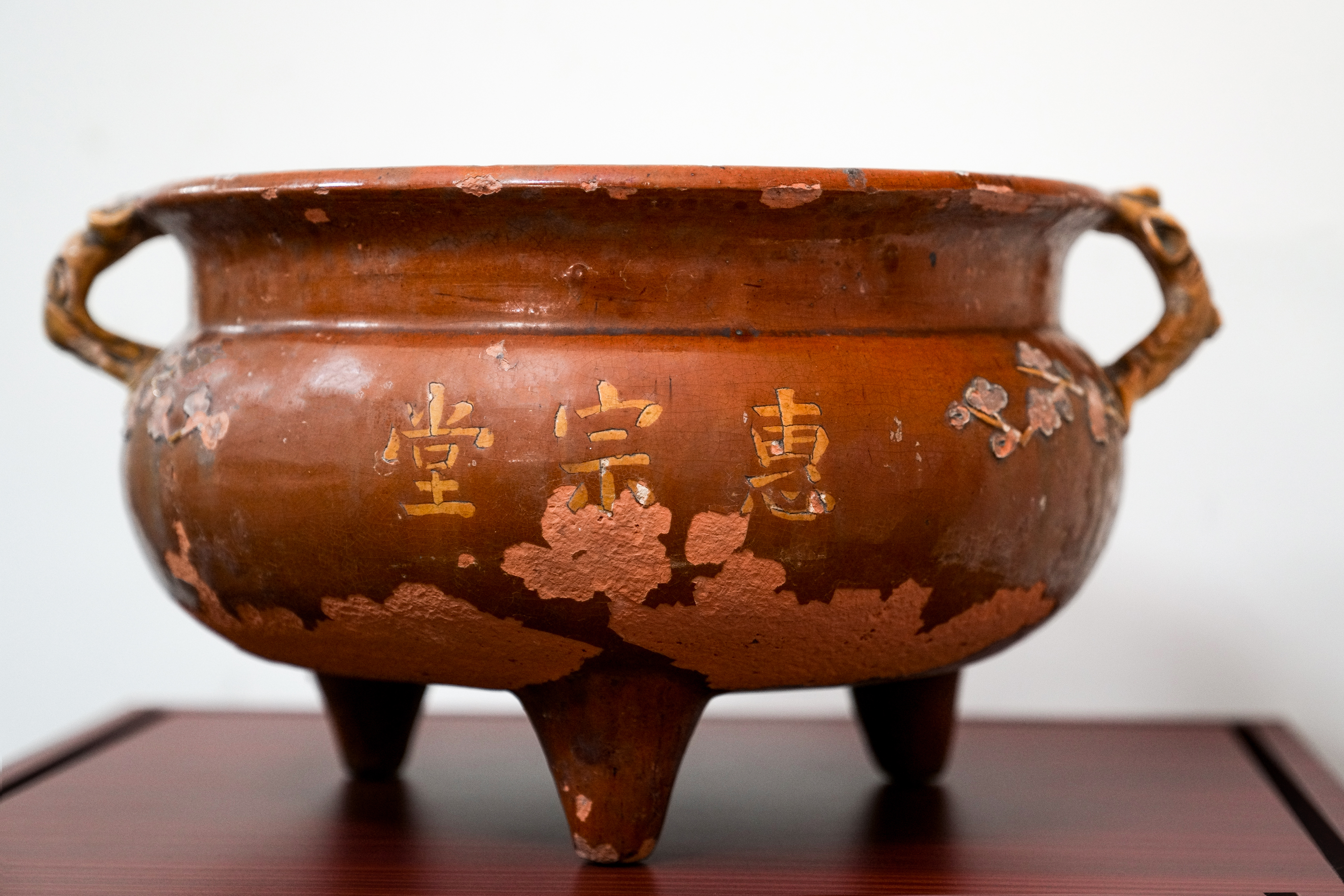 香爐下方局部有嚴重的脫釉現象,有損傷但狀況穩定 。