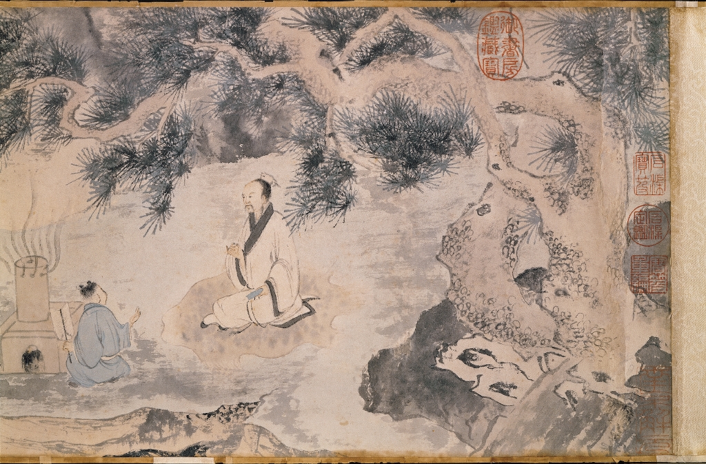 本幅畫松蔭下藥師席地而坐,童子執扇燒藥。作者以低沉遠山,突顯主景人物,人物雖簡,然神態畢具。畫中山洞、懸崖,勾勒輪廓的線條靈活流動,松樹扭曲虯轉,充滿律動感而生機勃發。 根據卷末唐寅自題及拖尾祝允明(1461-1527)書〈醫師陸君約之仁軒銘〉,唐寅因罹患肺病,須求好藥,本幅乃是向陸約之求藥後的答謝之作,依畫風與款書,屬唐寅晚期作品。