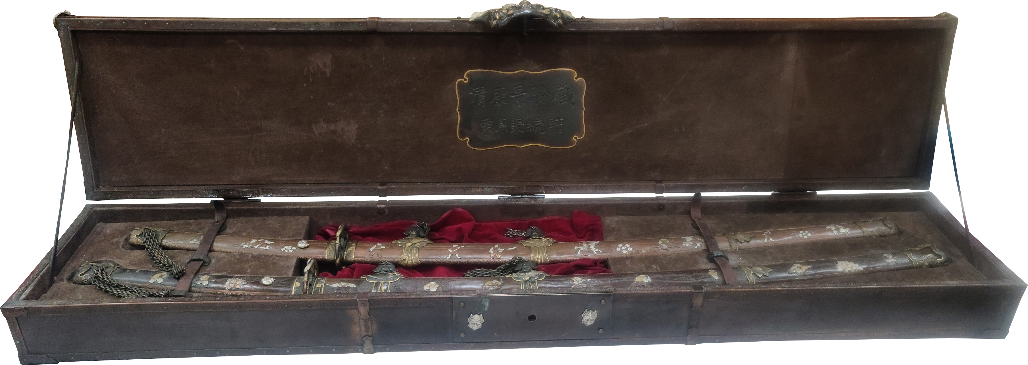 據擁有人陳蒼興口述,此筆武士刀文資,源自民國34年(西元1945年)日軍戰敗並撤離臺灣,數位日籍軍官身邊均有貴重文物古董,無法攜帶回日本,大致為日製古代文物、紀念性武士刀等,軍官們雖有不捨,最後商議決定贈與服務於日本總督府之洪明山先生。 此件文物,製作工藝相當精緻,大致由金、銀、銅、錫、鋁等多種合金冶製而成,並由精緻收藏錦盒存放,洪明山直到民國65年(西元1976年),因行動不便才交於洪植一,後因其後代子孫無興趣收藏,讓渡於目前所有人陳蒼興。