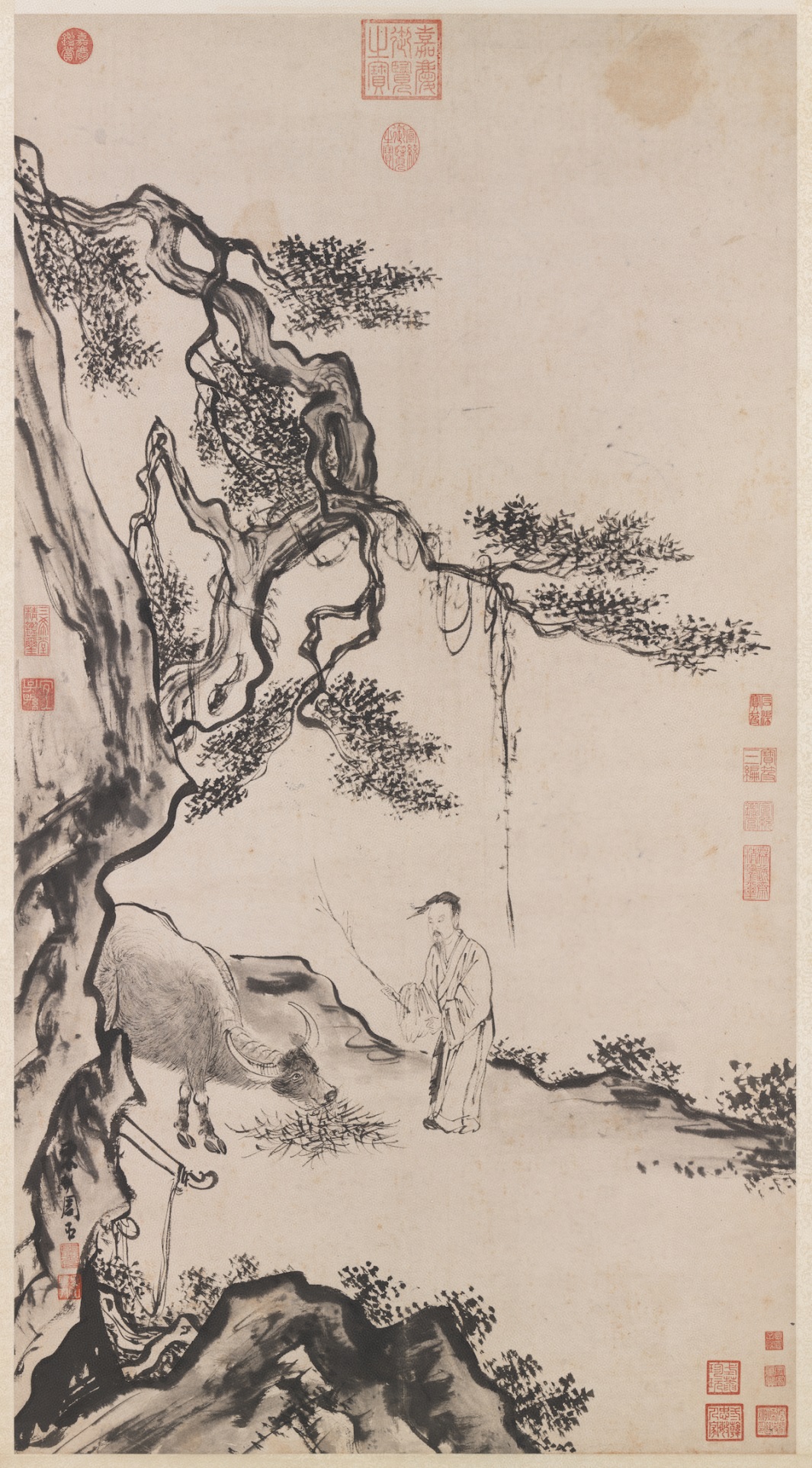 周臣(約1450—1535),字舜卿,別號東村。吳郡(江蘇蘇州)人。畫山水師陳暹,得宋人法。兼工人物,古貌奇姿、綿密蕭散,各極意態。 本幅典故源自《呂氏春秋舉難》,敘說春秋時衛人甯戚(西元前七世紀),藉驅趕牛車,與齊國桓公(約西元前716—643)相遇。甯戚敲擊牛角,高歌抒懷。桓公聞聽歌曲內容,知其非尋常百姓,乃延聘為丞相。 幅中的樹石,皴筆豪邁飛動,幾近浙派風致。