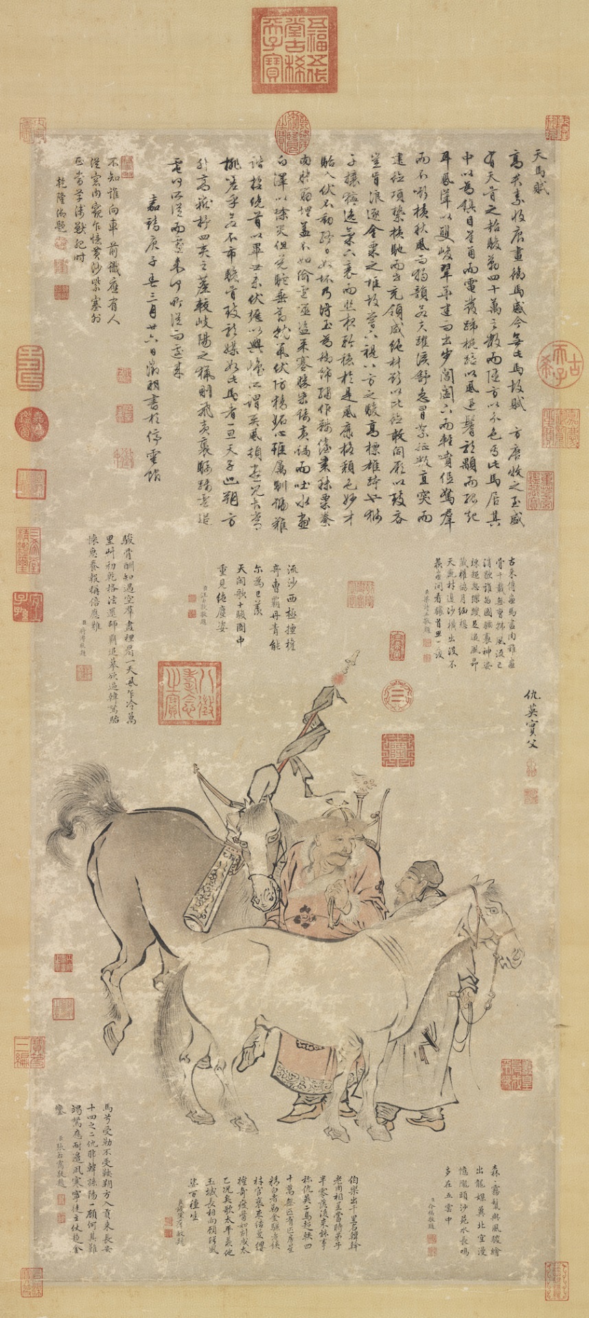 仇英(約1494-1552),字實父,號十洲,居蘇州。從周臣學畫,擅長山水、仕女、人物。與沈周、文徵明、唐寅,並稱明四家。 畫上方有文徵明題〈天馬賦〉,書法自然流暢,據其紀年可推知此作的完成年代約為嘉靖庚子年(1540),時仇英約四十七歲。本幅畫圄人控馬,人馬的線條粗細分明,筆致勁健,充滿提頓的變化,有別於其精麗艷逸的一格,於仇英作品中相當罕見,堪稱其寫意人馬題材的精彩之作。