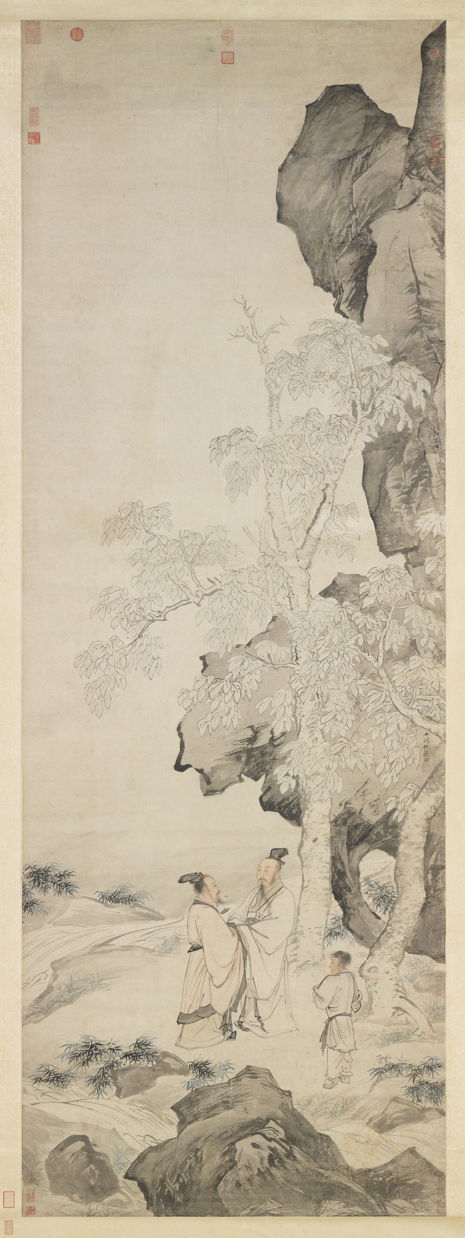 仇英(約1494-1552),字實父,號十洲,居蘇州。從周臣學畫,擅長山水、仕女、人物。與沈周、文徵明、唐寅,並稱明四家。 本幅畫石峰嶙嶙,梧桐垂蔭。樹下兩人拱立清談,一童悄然侍立。前景另繪叢篠沿坡,野水奔流。此等景境,縱或出自畫家揣想,然而人語溪聲,竟恍若身歷其境。 本件與仇英〈蕉陰結夏〉原本同屬於四屏的組畫,今故宮收藏其二,頗為難得。寫意的畫法固然師承自周臣,但運筆使墨較為謹慎,能在勁健挺拔的線描中,兼顧形象的精準掌握,是存世仇英極為難得的大幅立軸鉅作。