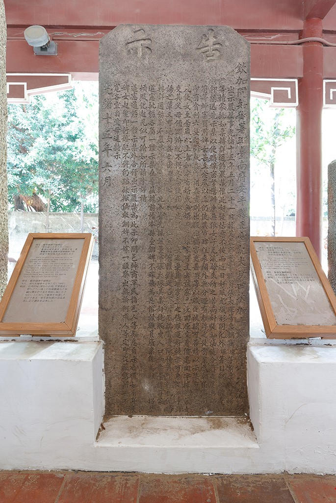 數量:1組1件。 主要材質:花崗岩。 尺寸:縱163公分*橫62公分*厚15公分。 特徵:全碑無紋飾,額刻「告示」二字。