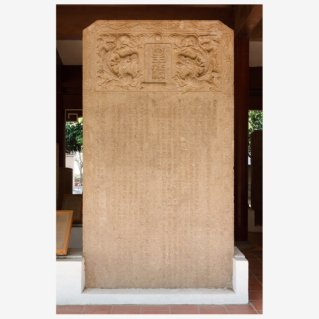 數量:1組1件。 主要材質:花崗岩。 尺寸:縱262公分*橫148公分*厚16公分。 特徵:邊框刻有花飾,額刻皇清、雙龍及太陽圖騰。