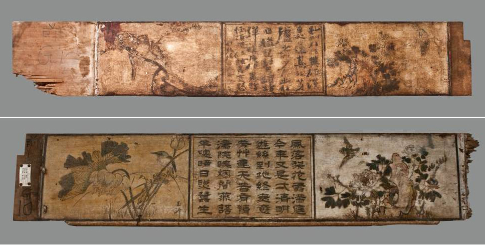 此件文物為陳玉峰於昭和12年(1937)所繪之作品,畫工精細,保存尚稱完整,極具歷史意義及藝術價值。尺寸長 177 /寬 36.5 (公分),作品主題為雅石花鳥圖、隸書、蓮花蜂鳥。尺寸長 213 /寬 35 (公分),作品主題為菊花、仿鄭板橋體書法、梅花。