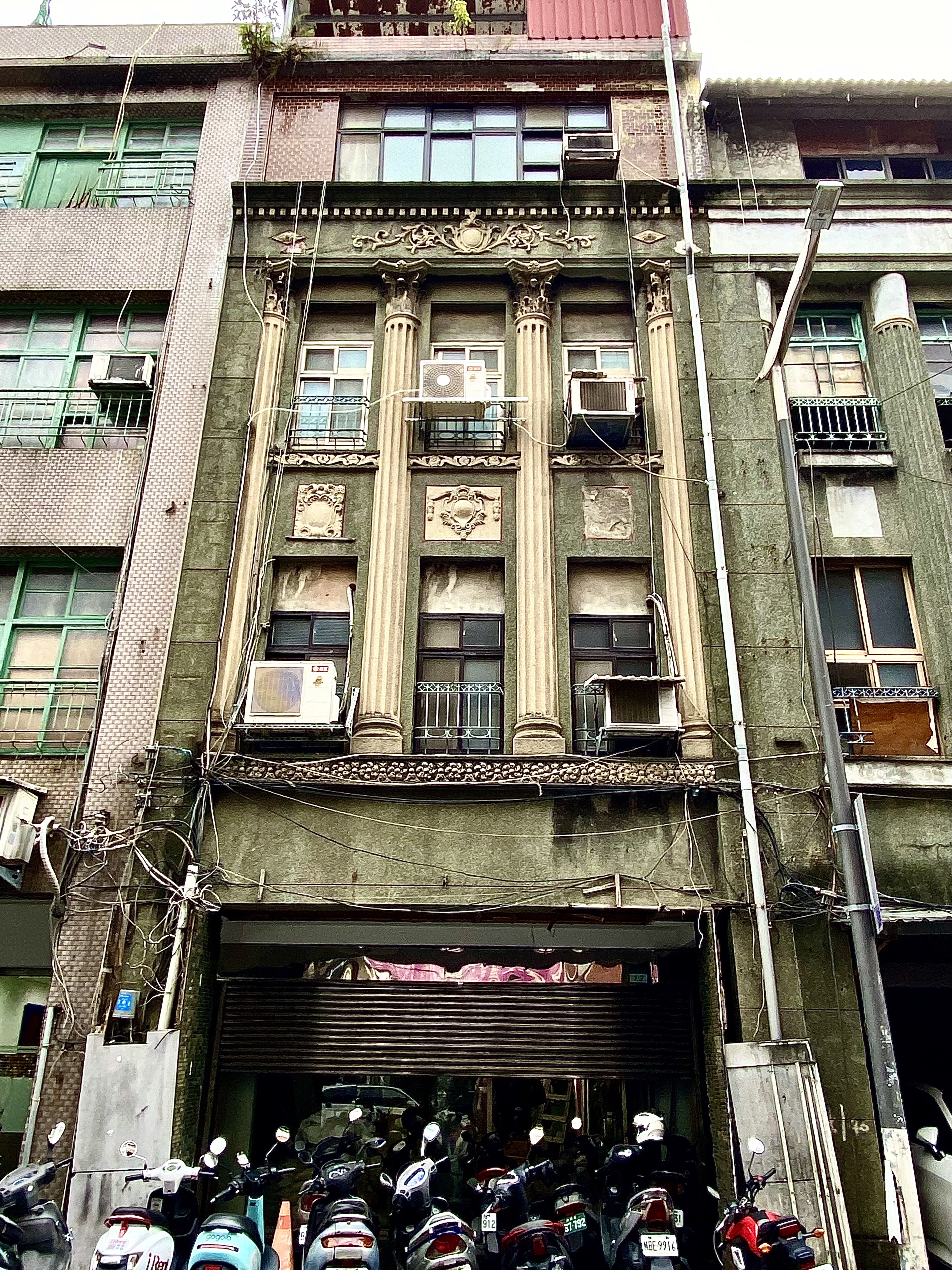建物初建於1951年,立面為三層樓四柱三間形式,保存當時流行的希臘科林斯式柱頭風格,列柱雕花、鑄鐵欄杆,牆面開模印花裝飾並反映1950年代街屋常見的建築工藝。