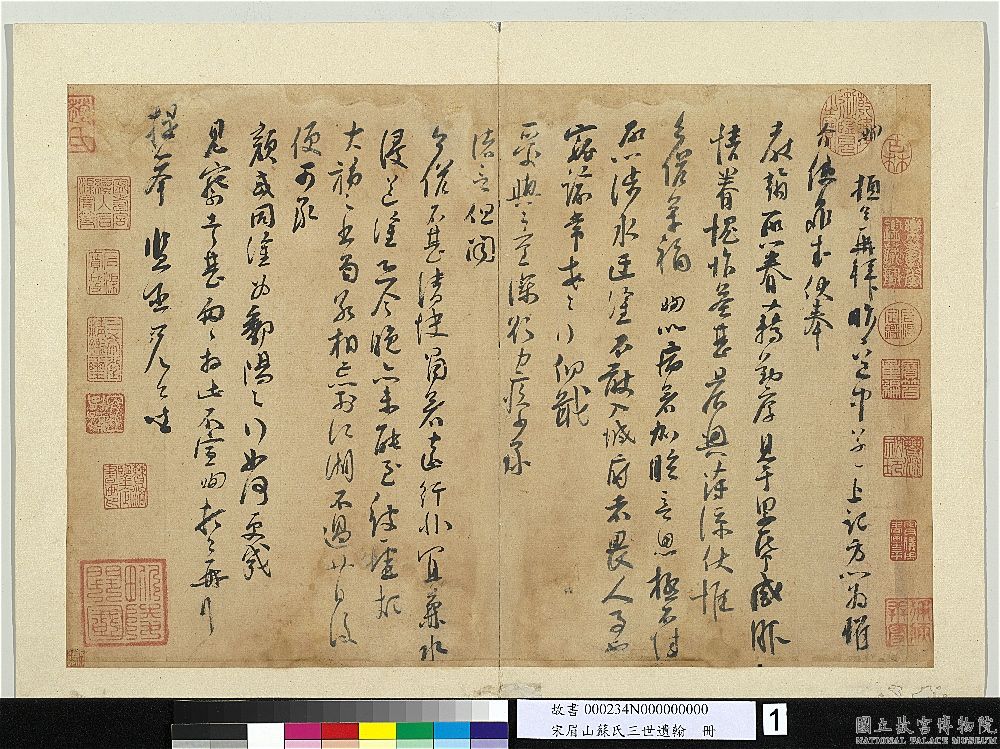 〈宋眉山蘇氏三世遺翰〉冊含宋四家之一的蘇軾(1037-1101)尺牘兩則、其父蘇洵兩則、其弟蘇轍五則,以及其三子蘇過兩則。蘇軾書法姿態橫生,縱逸而不失法度,展現瀟洒奔逸氣質。蘇轍書風與其兄蘇軾相近,姿態灑脫,結字略扁斜傾,惟不若蘇軾多逸態,而蘇過亦以善書知名。蘇洵、蘇轍和蘇過的傳世作品不多見,此冊能將蘇氏一門三代之書蹟同時收列,展現其書法同源卻各具面貌,具有重要的參考價值和文化意涵。 共 11 件 8 開,12 幅,包括: 1. 蘇洵致提舉監丞尺牘 2. 宋蘇洵書尺牘 3. 宋蘇軾書尺牘 4. 宋蘇軾書尺牘 5. 蘇轍致知郡承議定國尺牘 6. 蘇轍致定國承議尺牘 7. 蘇轍致定國使君尺牘 8. 蘇轍致定國使君尺牘 9. 蘇轍致定國承議使君尺牘 10. 蘇過致貽孫仙尉尺牘 11. 蘇過書贈遠夫詩。