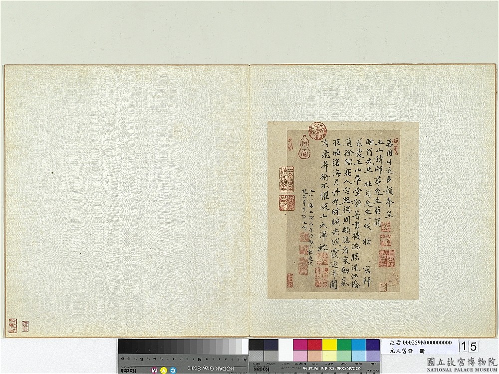 〈元人舊蹟〉冊共十五幅,分別是趙孟頫、虞集、宣昭、朱德潤、饒介、楊維禎、余闕之尺牘,以及張雨、僧守仁、祖瑛、郭畀、馬治、張宇初、張穀、王憲等之詩文。其中,趙孟頫、虞集、楊維禎、張雨、饒介等書風都具時代代表性;而朱德潤、郭畀書畫俱擅,聞名藝壇;此外,張宇初為道教四十三代天師,守仁、祖瑛皆為佛門名僧,俱享文名。全冊不僅具有藝術價值,也具有重要歷史意義。 共 15 件15 開,15 幅,包括: 1. 趙孟頫致萬戶相公尊親家尺牘 2. 虞集致丹丘博士公尺牘 3. 宣昭致九成隱君先生尺牘 4. 郭畀書七言律詩 5. 馬治書樂府三首 6. 朱德潤致吳季實教諭尺牘 7. 饒介致士行國士先生尺牘 8. 楊維禎致理齋明府相公尺牘 9. 張雨書上閒止徵君七言律詩 10. 僧守仁書七言律詩二首 11. 祖瑛書錦箏鳴詩 12. 余闕致太樸內翰尺牘 13. 張宇初書識語 14. 張穀書七言絕句三首 15. 王憲書呈玉山詩師尊先生七言律詩。