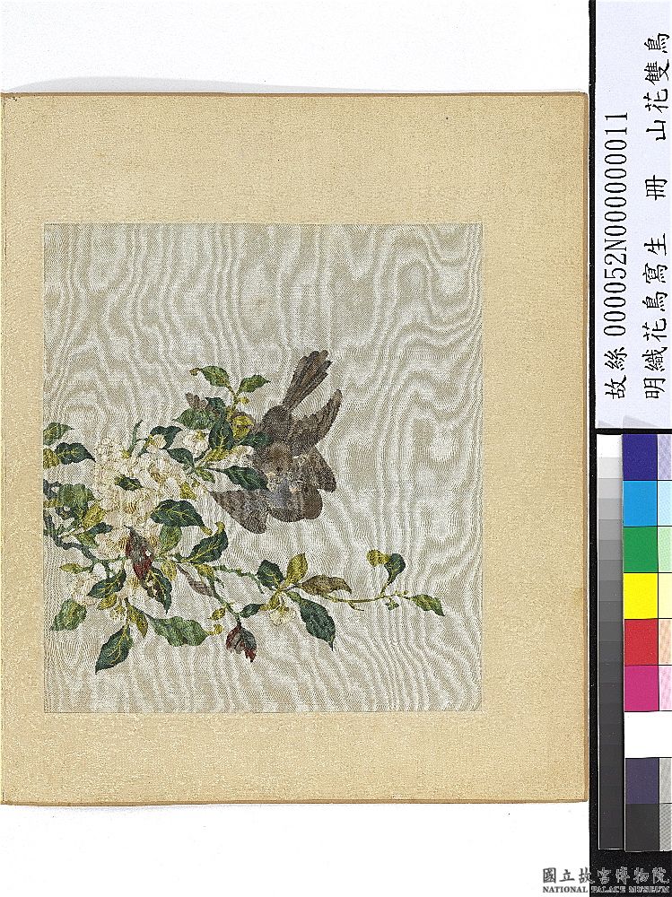 全冊十二開,織各式花鳥、草蟲。設色明麗,刻織技巧穩健傳神。此冊構圖與繪畫相近,織法巧妙搭配鮮亮絲色的運用,花鳥逼真生動的形象與織法的獨特紋路完美融合,反映出明代緙絲的傑出工藝成就。