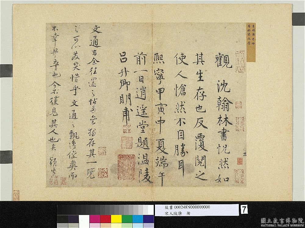 〈宋人牋牘冊〉收錄宋代諸名臣、文士,如徐鉉、蘇軾、米芾、沈遼、呂升卿、蔣之奇、孫覿、呂公綽、張孝伯、霍端友等人共11件書蹟,世甚罕見。內容為尺牘書信,可補文獻史料之不足,並可從中窺見古代社會的真實生活層面,是深入了解宋人文化的重要媒介。其中徐鉉、蘇軾、米芾、沈遼、張孝伯等更是書史名家,其餘也都代表當時文人書寫的實貌,全冊豐富多元,是集結宋代書家相當重要的法書名蹟冊。 12開: 1. 宋徐鉉書尺牘 2. 宋蘇軾致運句太博尺牘;宋蘇軾致南圭使君尺牘 3. 宋蘇軾致若虛總管尺牘 4. 宋米芾書尺牘;清高宗題 5. 宋沈遼致穎叔制置大夫尺牘 6. 宋沈遼書尺牘 7. 呂升卿題;蔣之奇題 8. 宋孫覿致務德知府學士尺牘 9. 宋呂公綽致邃卿學士尺牘 10. 宋張孝伯致叔丈知縣中大尺牘01 11. 宋張孝伯致叔丈知縣中大尺牘02 12. 宋霍端友書尺牘